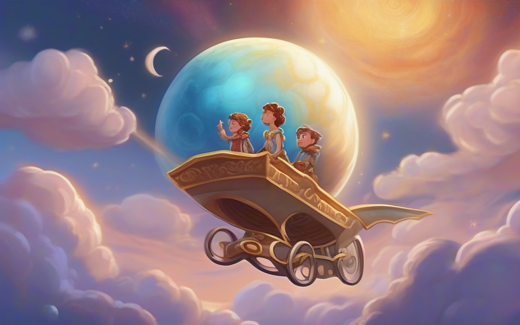 With her heart full of ancient stories, future hope, and the quiet blessing of the moon, Elara turned the Aether Chariot homeward. The journey back was just as magical, though tinged with the sweet sadness of an adventure ending. The stars seemed to wink at her knowingly, the clouds waved gentle goodbyes, and the comet’s distant glow reminded her of the endless possibilities. As dawn broke, painting the horizon in hues of rose and gold, the Aether Chariot gently descended, landing softly in her workshop, exactly where it had begun. Elara climbed out, her feet back on solid ground, but her spirit forever changed.
