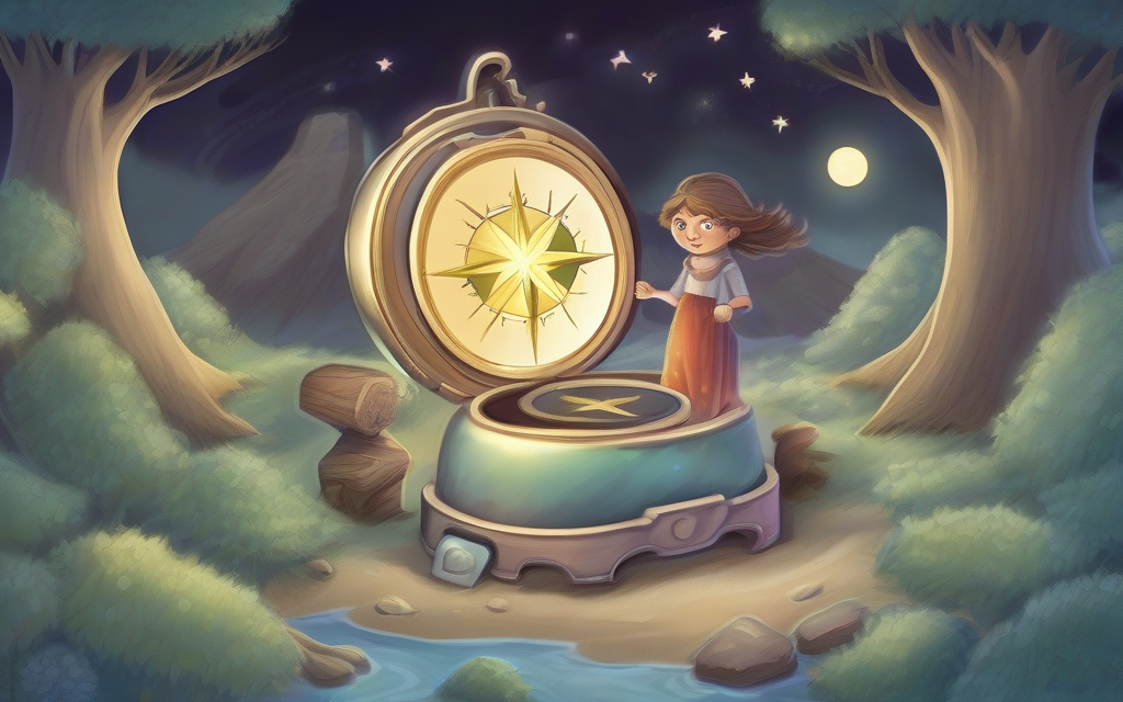 The compass pulsed, now guiding her towards a shimmering blue light ahead. It was a river, its waters so clear they reflected the sky in perfect miniature. But this wasn’t any ordinary river. As Elara approached, a bubbly voice gurgled from the water.