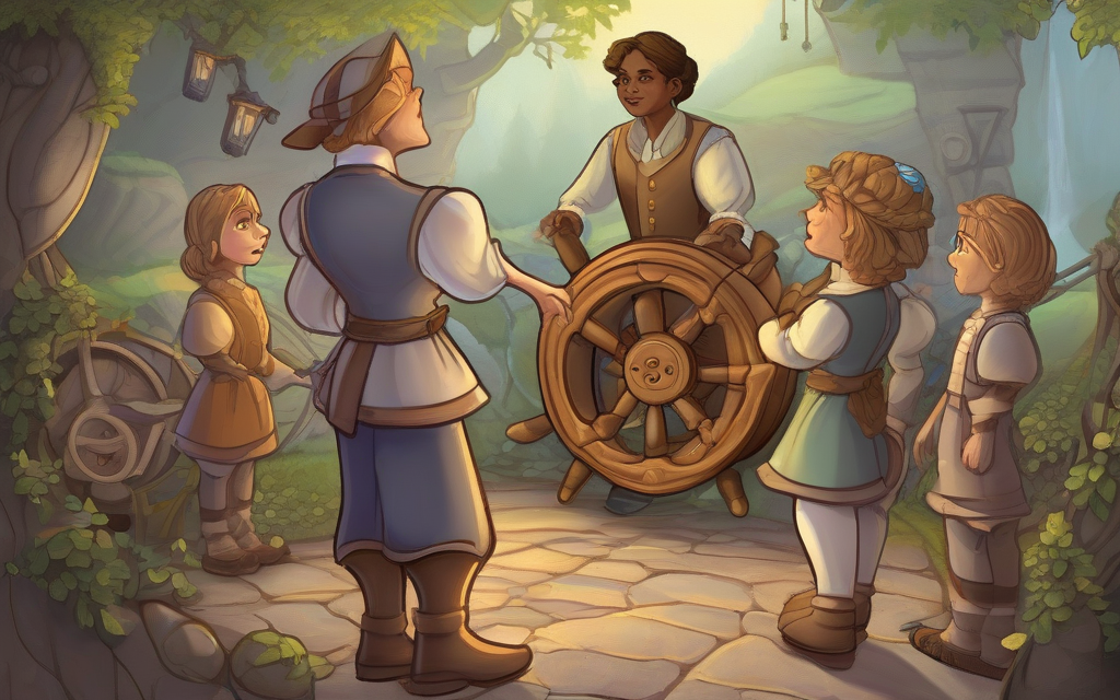 “Each spoke holds a whisper of the world’s power,” the Forest King explained. “When need truly calls, turn a spoke, and a small helper will heed your heart’s plea. Use it wisely, for even the smallest turn can shift the greatest tides.” With a knowing nod, the King melted back into the shadows, leaving Faelan alone with the mysterious wheel.